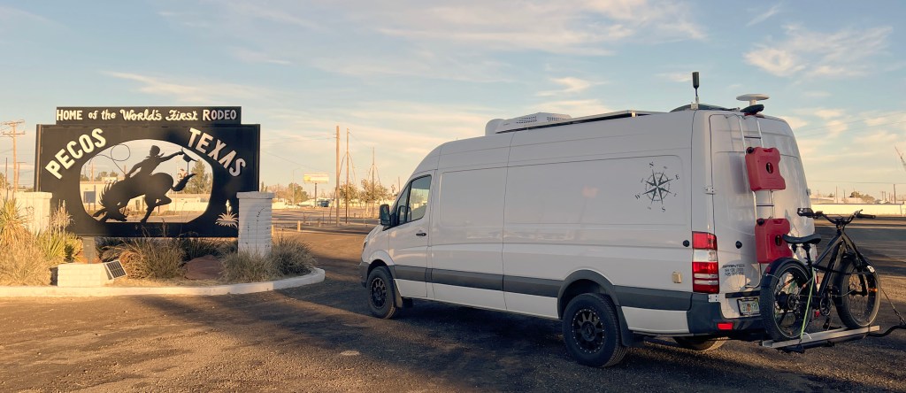 30 December…I’m in Fort Stockton TX (famous for the Buffalo Soldiers)…LONG drive over from La Grange…tomorrow I’m starting what I came out here for…heading through the cowboy country of west Texas…up to UFO county around Roswell, then over to Lincoln NM…ground zero of the Lincoln Country Wars of the late 1880’s…google is your friend…then to White Sands National Monument (lots of rockets and things that blow up)…gotta get some more neat stickers for the van and take some more photos of “Trouble’s Traveling Cup” πŸ™‚