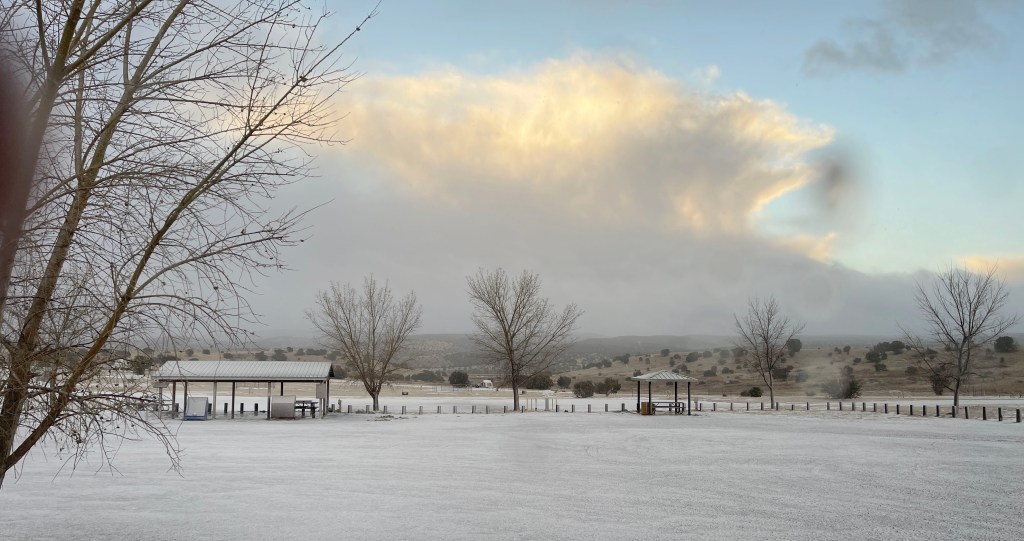 2 Jan…super quiet but rockin night last night…only a couple of other campers here and they’re at least a quarter mile away…rockin cause the wind was howling…this morning I woke to a winter wonderland…then an hour later I’m socked in with a snow storm…I love this stuff…so comfortable in the van during these times…I’m sitting in the lounge area with the Espar diesel furnace blowing warm gentle air on me…the cup of coffee is warming my hands…life is certainly good.