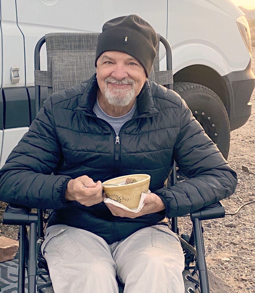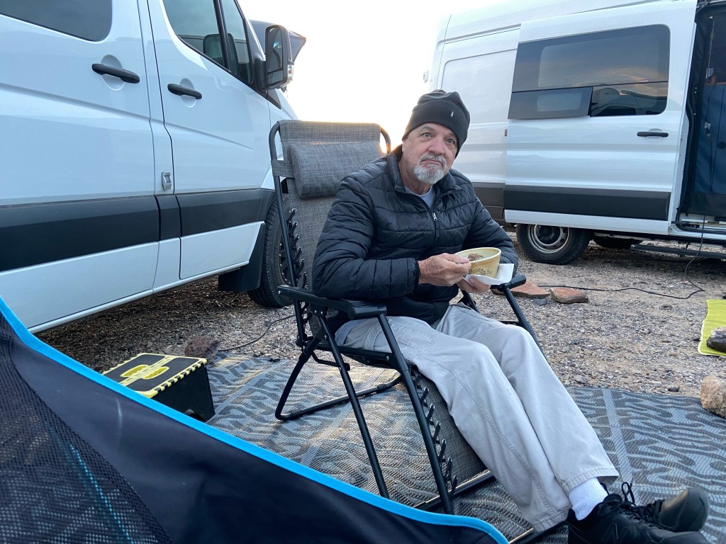 14 Jan….we moved down to the south end of Plomosa Road yesterday…easy camp setup….had a GREAT pizza in town and got Vee’s water replenished…thought you’d like to see how I look when I eat stew ๐