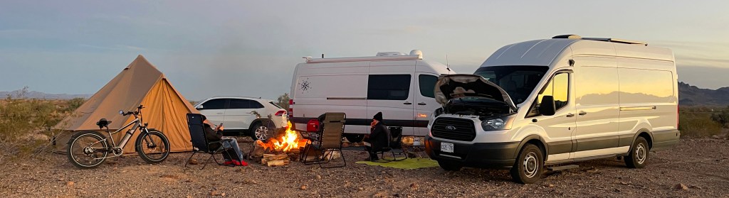 Mine and Vee’s vans and Anthony’s condo tent…the tent has LED lighting, central heat, queen sized bed, and a large cast iron bath tub.