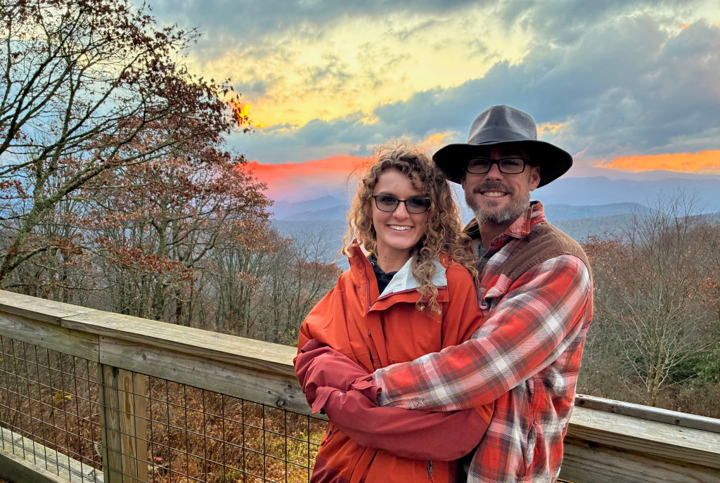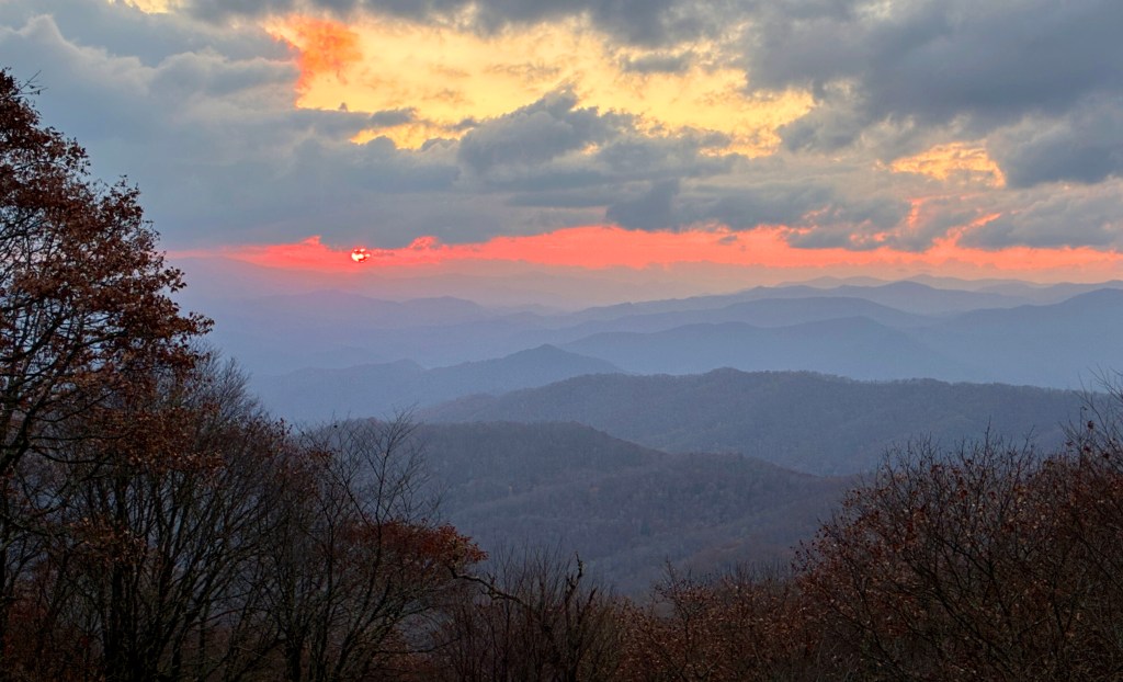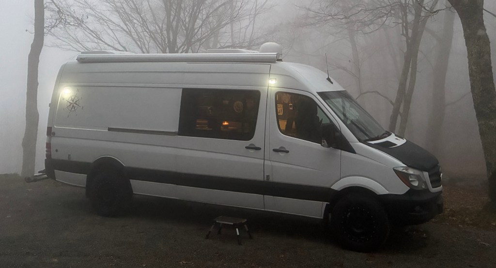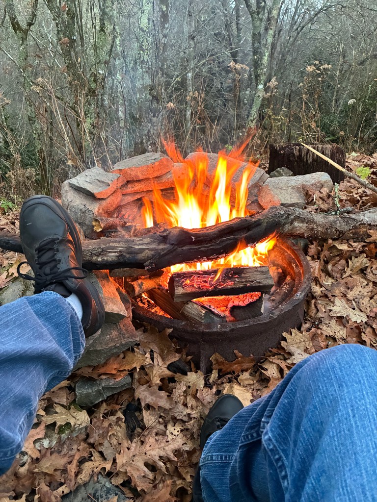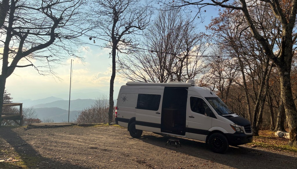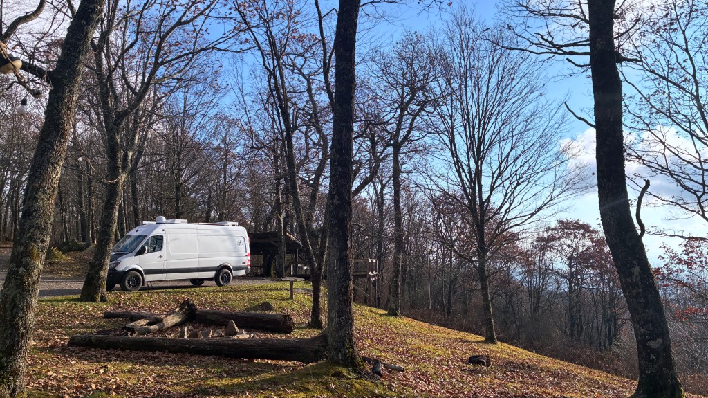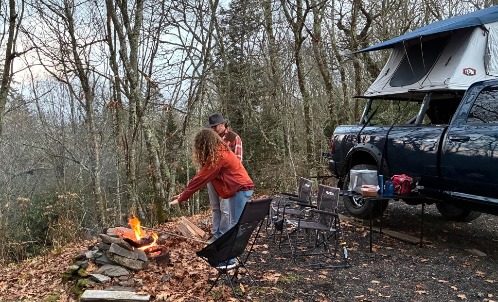 9 November…Rob, his girlfriend katie, and I drove up to the Mile High Campground near the Blue Ridge Parkway to camp yesterday….main road was closed but Rob knew a back way in….nice gravel road up the mountain…we had the campground all to ourselves as it’s closed for the season…no barrier gate so in we went….Rob and Katie had their nice rooftop tent and of coarse me, I had my house on wheels…beautiful views…homemade chilli cooked over the fire and all was well with the world…we sat around telling jokes and generally acting stupid till about 9 pm…that was my bedtime πŸ™‚