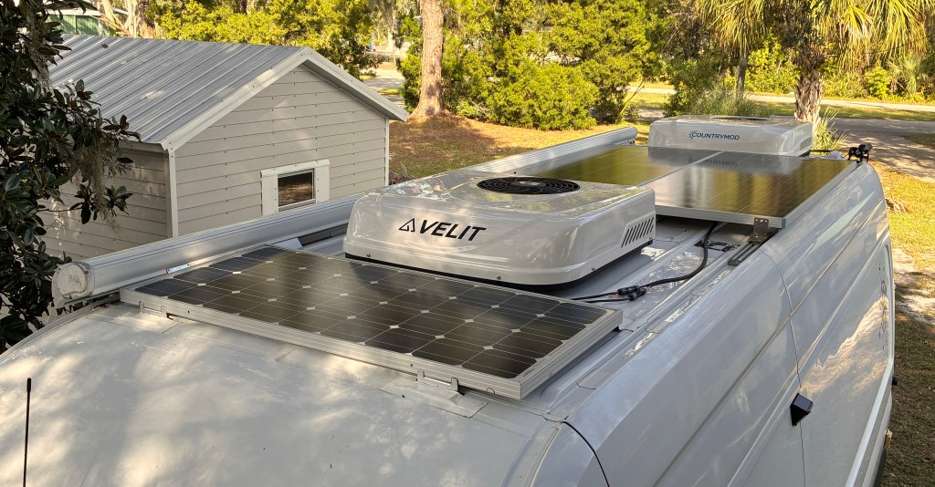 14 November….nice drive back to FL…Petunia is running like new….removed my DISH Network satellite dome from the roof at the front of the van and and mounted another solar panel in it’s place…I had a couple of extra 100 watt Renogy panels in the shed….one fit perfectly where the dome was…I now have 500 watts of solar on the roof of the camper….along with my 400 watt portable suitcase panels I should be set.