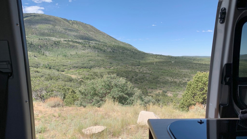 6 July…coffee around 0700 this morning…beautiful day…drove down the mountain into Monticello to get water…ask the clerk at the Maverick for the key to the water spigot on the east side of the building, attach you hose and filter, get as much free water as you wish as it’s one of their services for traveling RV’ers…nice…got 10 gallons…restocked all the groceries at the Blue Mountain Market…$116…will last me several weeks…I do all my own cooking and don’t hardly ever eat out…I’m cheap…gonna head to 3 Step on Wednesday for the night…will be storing the trailer and buggy there until I return in September…then heading out Thursday morning to my buddy Len’s place in Silver City NM…will take a couple of days to drive the 500 or so miles…I love traveling slowly…don’t have a clue where I’ll spend Thursday and Friday nights…plan on being at Len’s on Saturday the 11th…I’m back at the the overlook up in the Abajo Mountains where I’d spent a few nights last week…nobody here…quiet, cool breeze…really nice to have all the doors and windows open while I type away on the blog.