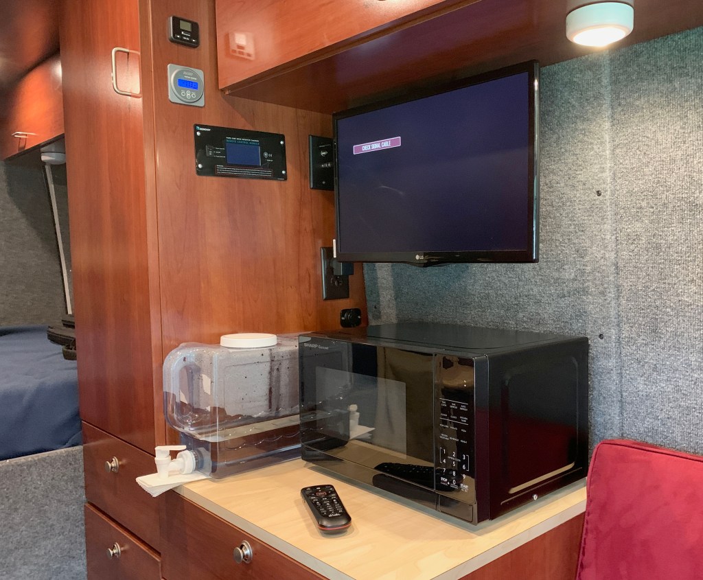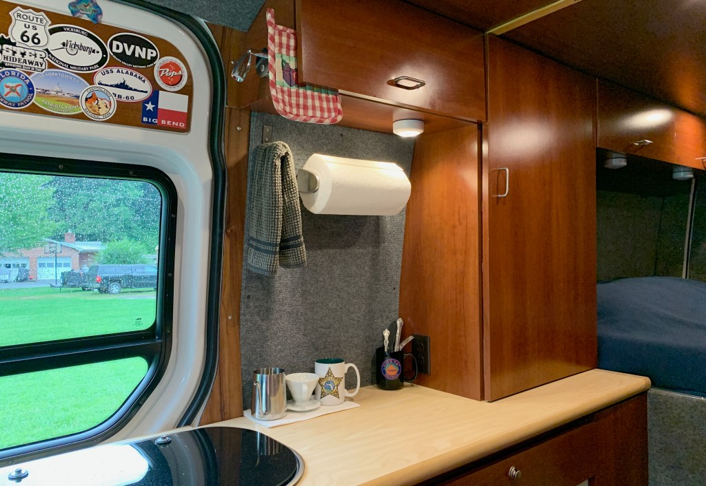 Raining today so I’m in the van napping, reading, and adding a bit to my online diary. Here’s a couple of photos of my kitchen and TV areas.