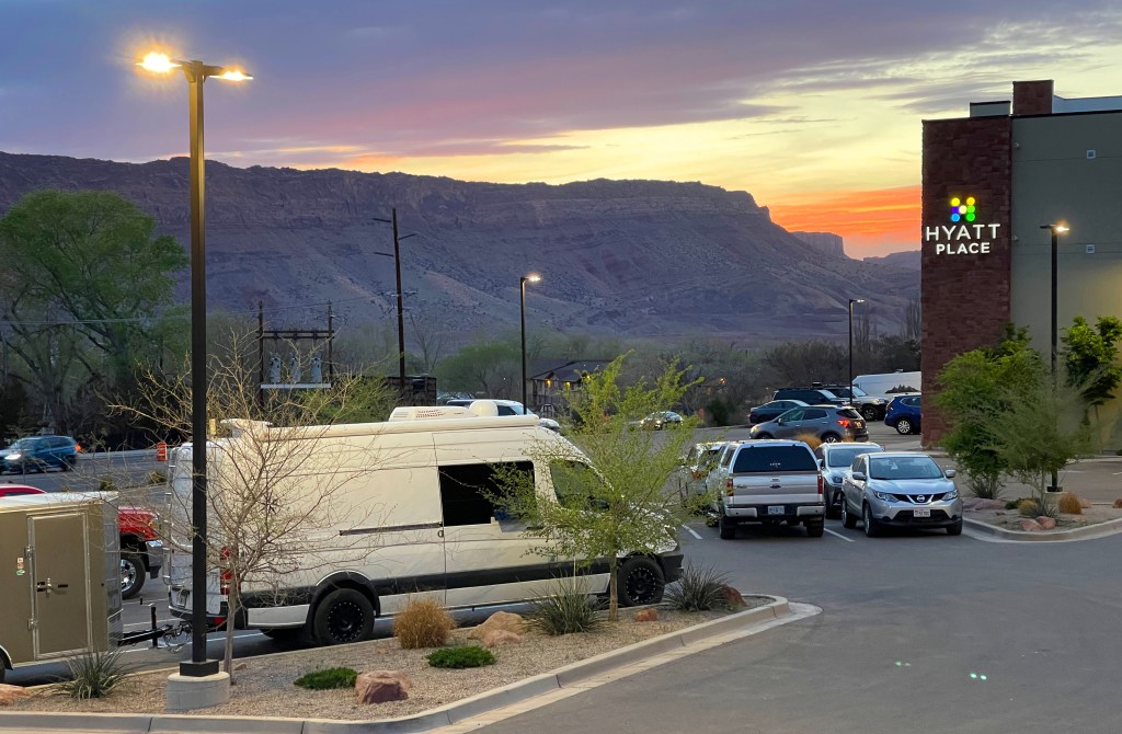 12 April…ahh this is the life…stealth camping in the parking lot of the Hyatt Place in Moab…my sister and her husband are out here from South Carolina doing a bit of sightseeing…we met up for a few days before they head home…they’re staying here at the Hyatt and gave me their parking placard to put on the dash of the van…with the blackout curtains up nobody can see I’m in the van…I’ll be here till Wednesday…today we drove the La Sal Mountain Loop and went out to Canyonlands NP…beautiful weather and relaxing day…they’re going for a jet boat tour on the Colorado River in the morning and I’m gonna sleep in!