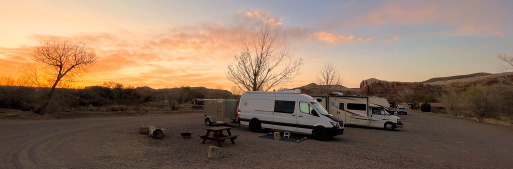 14 April continued…had a nice drive down to Bluff Utah this morning…the wind is picking up…my sister and Scott will be staying at the Bluff Dwellings Resort…really nice…I got a nice spot at the Cadillac RV Park right around the corner…$33 a night…not bad…at 3 pm the wind was howling…there was so much dust in the air I couldn’t see the mountains in the distance…I guess the wind speeds were around 35 mph sustained and up to 60 mph gust…geez…I stayed sealed in the van all afternoon…around 7 the skies started to clear up.