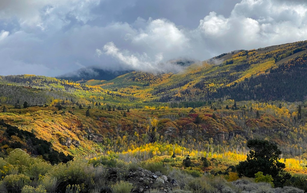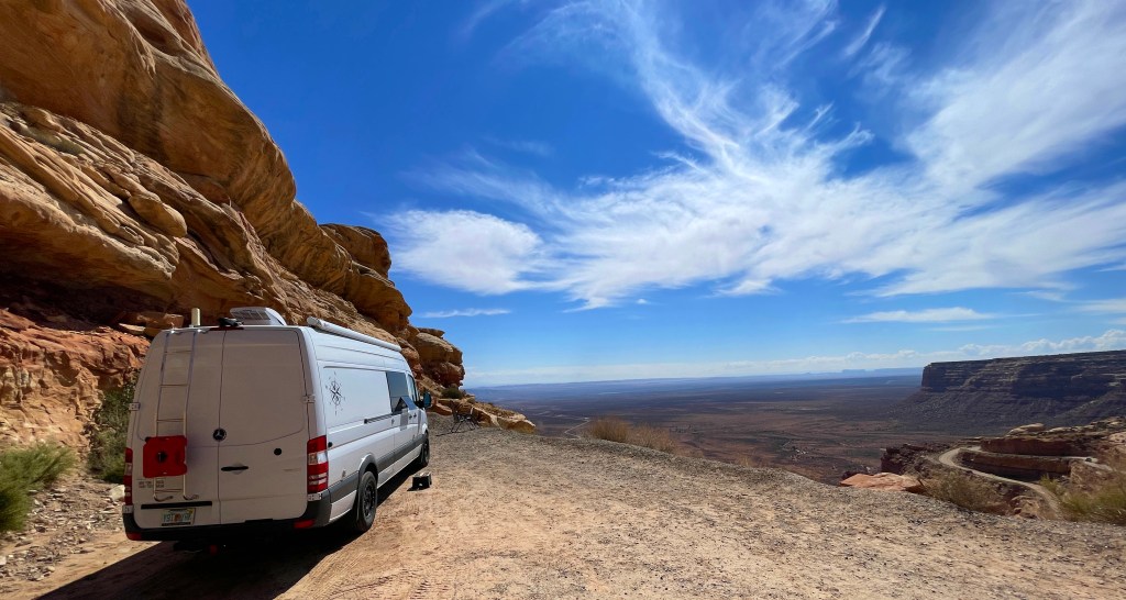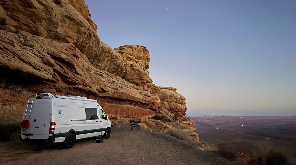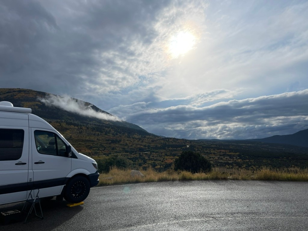 29 September…0530…a gentle rain is falling this morning…I’m up and having a cuppa…I love waking to a rain storm…there’s something calming being nice and comfy in the van…the Espar heater is humming along quietly and all is well in my world…a couple of other vans parked next to me…they arrived late and quiet…nice…headed up in the Abajo Mountains today…my favorite boondocking spot on the overlook is yelling for me…:)…gotta stop by the grocery store to get some grub…my new fridge is smaller than the Dometic I had so I need to stop more often…that’s ok…cleaned some of the grit off Petunia yesterday when I got here…gonna wait till the roads dry before heading out…don’t want to spoil my work with more road spray…OCD?:)…maybe but I like to keep my stuff nice…paid hard earned money for it…it’s my home.