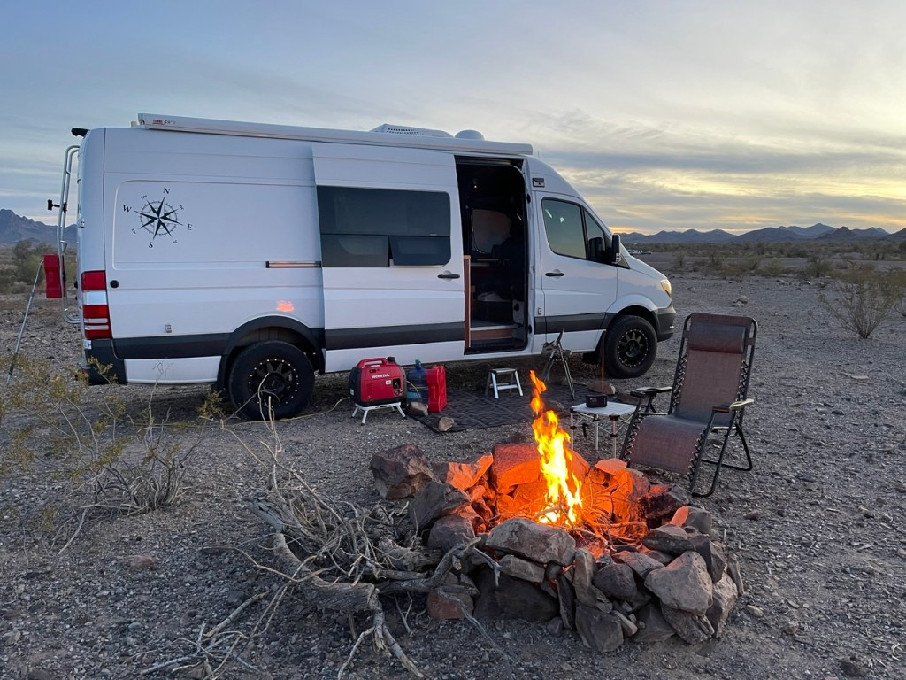 Jan….I’m all set up at one of my favorite boondocking sites…it’s near the town of Bouse AZ just off Plomosa Road…not many campers around me…seems like there’s only about half the folks out here this year…that’s nice…fairly good internet so I can watch videos on Youtube for my nightly entertainment…I’d say 99% of the stuff on Youtube is pretty boring but if you poke around you can find some gems…got a nice aluminum table to keep my generator off the ground and out of the dirt…supposed to hold up to 175 pounds so it should work well…refining my set up once again.