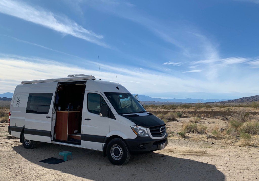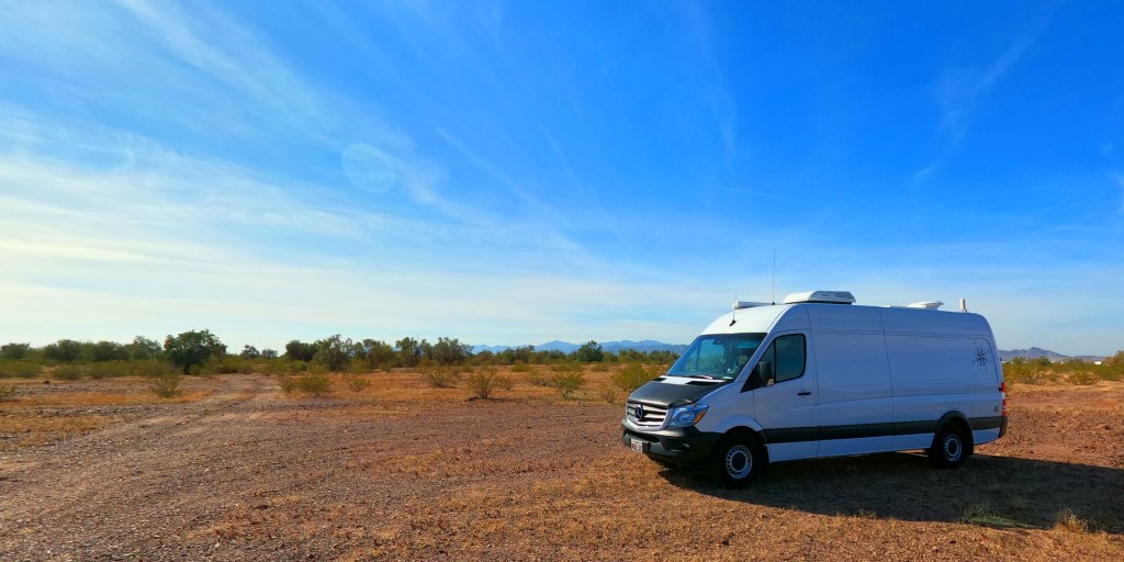 17 Jan 1130…my boondocking spot out here on Plomosa road was getting a little crowded so I moved about a half mile on down the road to a little turn off. There’s a small ditch where you turn that’s kept anyone else from turning in there. The van crossed it just fine and now I have acres and acres off land all to myself. I’m still close enough to the road to hear the traffic but it’s nice and subdued.
