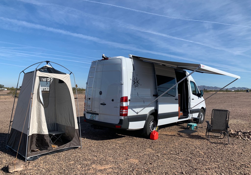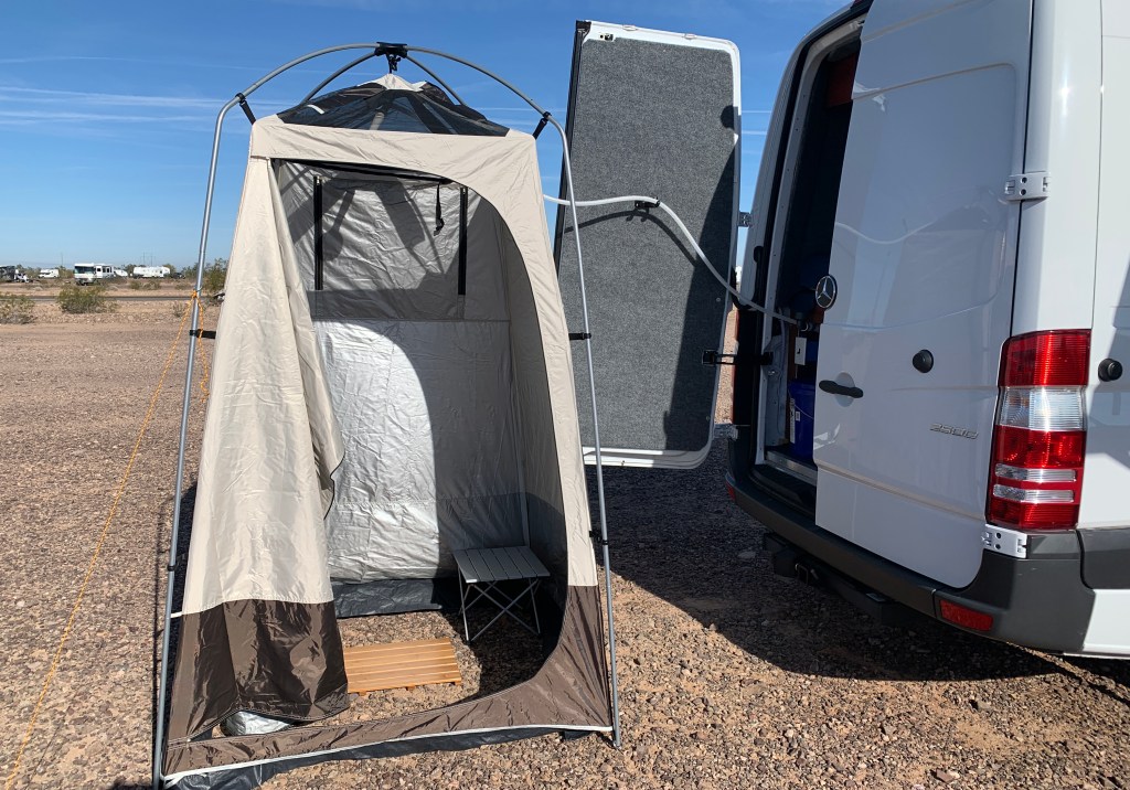 I had a wonderful two days in Lake Havasu City visiting with Susan and Phillip. They are good, decent humans. Thanks again for the hospitality 🙂 I’m back at my campsite north of Quartzsite and got my shower set up. It appears to be good quality with double stitching on the seams and easy to set up.