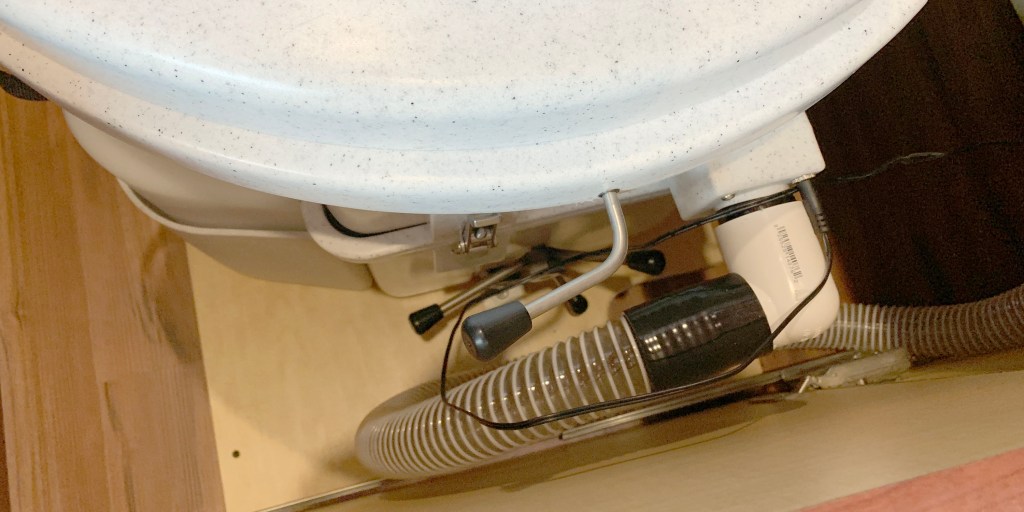 I also took the time this morning to change the medium in my compositing toilet as it’s been about a month since I last did it. It’s an easy task. Slip off the vent hose, unplug the exhaust fan, release the unit from the sliding shelf and take the whole thing outside. I only weighs about 25 pounds. Separate the upped and lower sections, pour the composted stuff in a trash bag, pour the liquids from the separate tank out in the bush, then use the shower thingy to spray it all down. Let’er dry, add a 10 quart bag of sphagnum peat moss and you’re done.