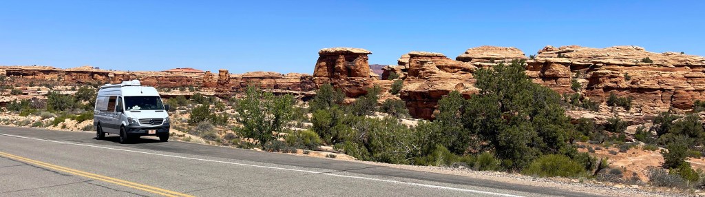 12 May…woke to a BEAUTIFUL day…finally…no wind, clear skies, and the morning coffee smells so good…lots of little chores this morning…checked the air in the tires, put a nice coat of wax on the van with the Meguier’s quick waxy stuff, sprayed the rear suspension with the anti-corrosive stuff I brought along (ACF-50), picked up an Amazon package at the Honda shop in Monticello, bought two bungie cords to hold my patio mat on the trailer so I don’t have to pack it in the back of the van, got milk, fuel, dropped the garbage off and then I was off to Moab for a few days of boondocking up in the La Sal Mountains.