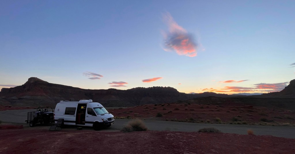 9 May…only slept for a few minutes at a time last night…winds were out of control from the south…reports said 30 to 40 mph sustained and gust up to 80 mph…the van was rocking and rolling all night…not as cold so that was nice…the diesel heater didn’t have to work very hard…the winds are forecast to subside in a few days…until then I’ll stay put here at the paved overlook to keep out of most of the dust…looking forward to getting back out in the desert soon…after I poke around Colorado next month I’ll probably leave the buggy at 3 Step until I get back out in the fall…no reason to drag it back to Florida for a couple of months…Florida is NOT SXS friendly at all.