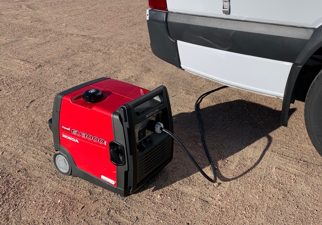 I LOVE my little generator! It weights 78 pounds so I can easily pick it up and slide it in the basement of the van. Very quiet with its high impact plastic body panels (no metal to resonate). In the ECO mode is just purrs along when charging the batteries and other stuff. When I run the A/C (I have a Soft Start installed in the A/C unit) it runs at full power but still nice and quiet. It also runs about 4 years on one gallon of gas 🙂 About $2300 on Amazon…here’s a link.