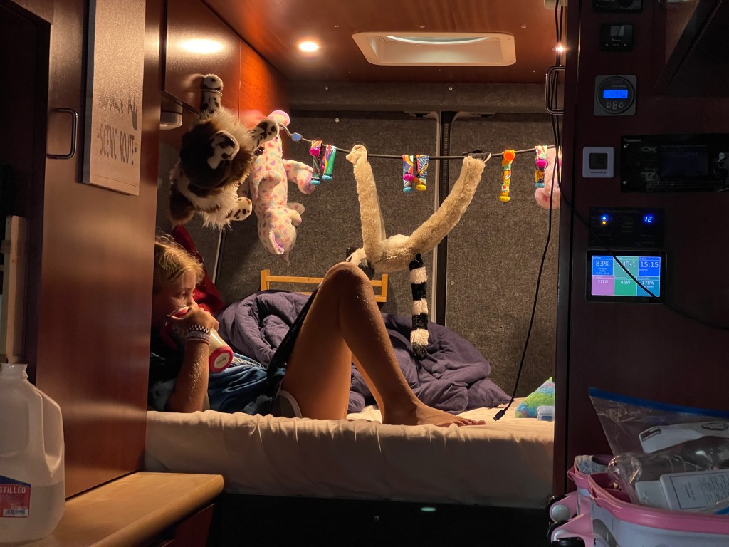 10 June….spending most of this summer in Florida while my niece Alyx is out of school…she turned 10 a few weeks ago and is a little bundle of joy…she’s out of school until the middle of August so I’m helping her dad out by entertaining her during the days when he’s working…he drops her off with me around 6 am each morning…I love hearing the little knock on the door of the camper announcing her arrival…she’s greeted with her favorite chocolate milk…I know my day is going to be great…I have the driver’s seat turned around so it makes a nice lounge chair up against the sofa…she takes her place, snuggled in the beautiful wool blanket my friends from Australia gave mom a few years ago….her iPad is humming along with her Dhar Mann videos…I ike them, they have some good messages in the stories they produce…life is good.