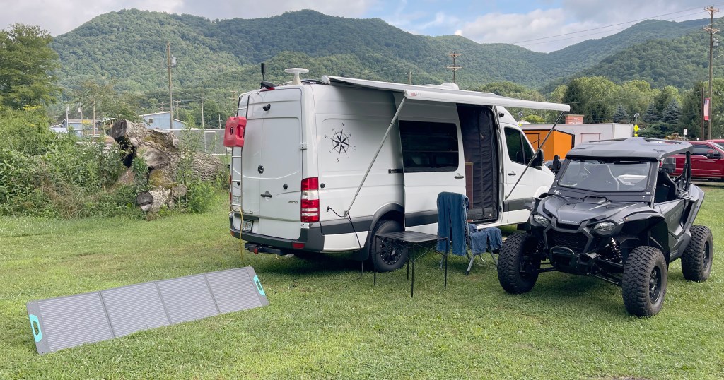 22 July…after a nice week with Alyx I headed back up to Maggie Valley…all set up and trying out my new Renogy 200 watt suitcase solar panel…high quality and folds up very small…installed a SAE plug on the outside of the camper…all I do is set the panels where I want them and plug in…super simple…all the solar feeds come together at the small busses then feed the MPPT controler and batteries…set and forget….I now have 600 watts of solar…the system runs the new AC and anything else I use completely from the sun.