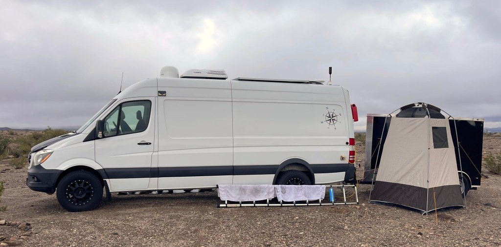 windy today…took the shower tent down to keep it from blowing away…temps are supposed to cool this week so I’ll drive into town when a shower calls my name…overcast…rain on the way tonight….love hanging out in the van during storms…something comforting knowing Petunia is keeping me warm and dry…yes I named the camper Petunia after one of my favorite human units…I readjusted the angle of the left solar panel so rainwater will run off the front or back…the way it was the rainwater ran down the side of the van causing the usual black streaks…I will soon see if my efforts were worth it.