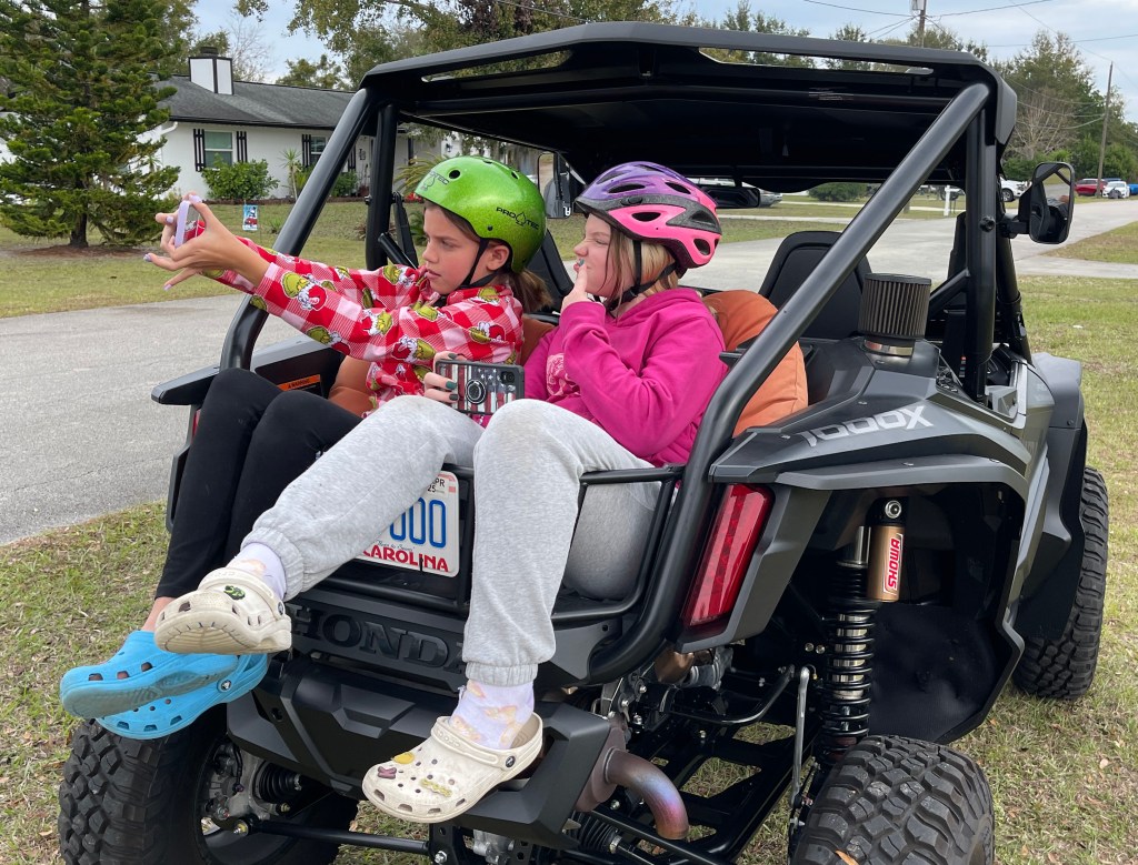 Alyx and Lilly enjoy riding around the neighborhood in the back of the buggy…now don’t get all upset…everybody cruises around the neighborhood in their golf carts and buggies…there’s no traffic and we never go more than a brisk walking pace…I make them wear their helmets…they don’t like it because they think they’re 9 feet tall and bullet proof…but when I told them the helmets would keep their hair in place it was ok because at 10 and 12 years old, looks are everything 🙂
